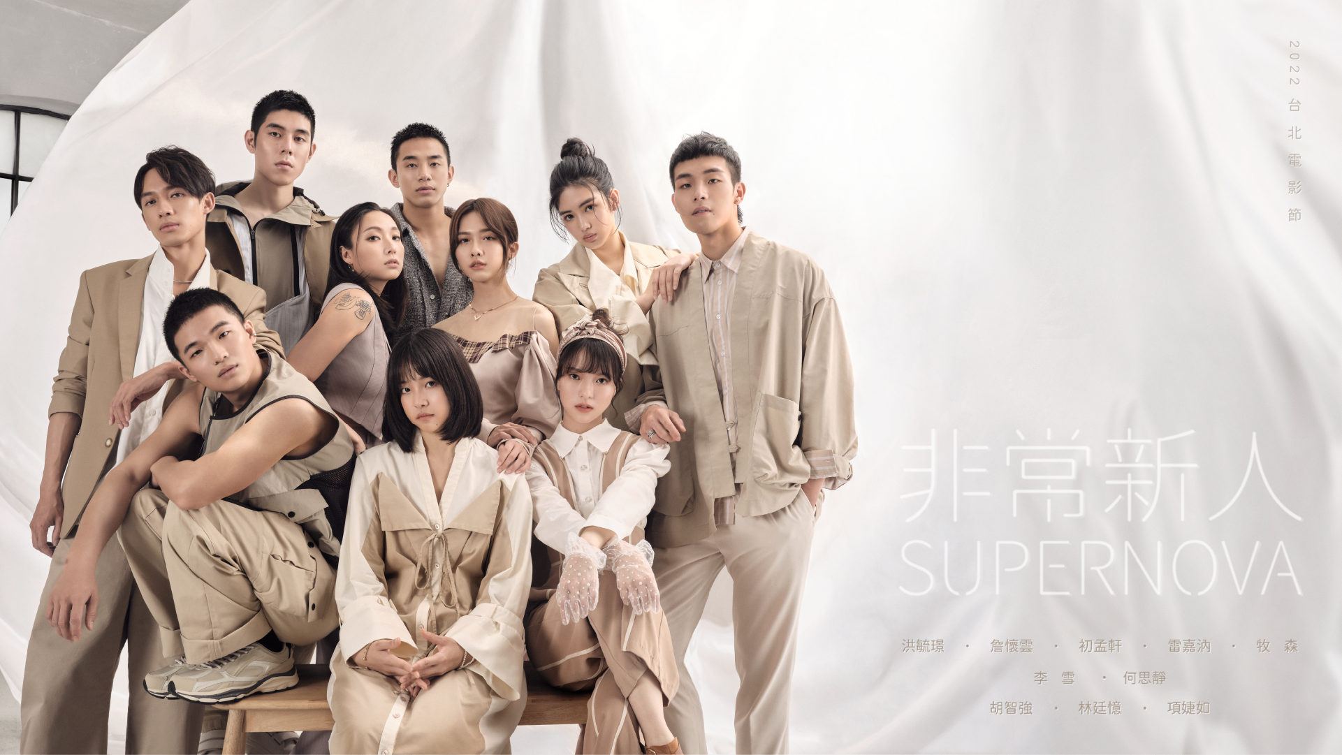 「2022非常新人」包括:接連以影集《華燈初上》少女版蘇慶儀、電影《我吃了那男孩一整年的早餐》校花方琦然掀起話題的何思靜;因演出影集《天橋上的魔術師》暖男哥哥Nori爆紅的初孟軒;手握兩座金穗獎影后,去年以《致親愛的孤獨者_凱涵》入圍金鐘獎的個性派女星李雪;曾演出女同短片《雨水直接打進眼睛》的氣質新秀林廷憶;林依晨同門師弟、演出同志短片《聽不見的距離》人氣飆升的牧森;過往客串不少影視作品,以影集《茶金》家僕「阿榮」一角廣為人知的洪毓璟(咚咚);在短片《龔囝》表現極具野性爆發力的胡智強;參與多部戲劇演出的森林系女孩項婕如,她的最新劇集《歡迎光臨 二代咖啡》也將於台北電影節世界首映;15歲就被大導易智言相中主演電影《行動代號:孫中山》的詹懷雲,以及在恐怖片《哭悲》挑樑女主角一鳴驚人的雷嘉汭。
